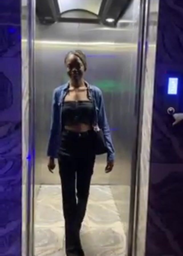 A woman exits a lift. She is wearing a black top, black trousers, a blue denim jacket, and sandals. She carries a black shoulder bag. The lift is stainless steel inside, with light-colored floor tiles. The lift opens onto a wall with a swirling blue pattern. The woman walks past the camera and another woman is seen walking away in the opposite direction. The lighting is dim.