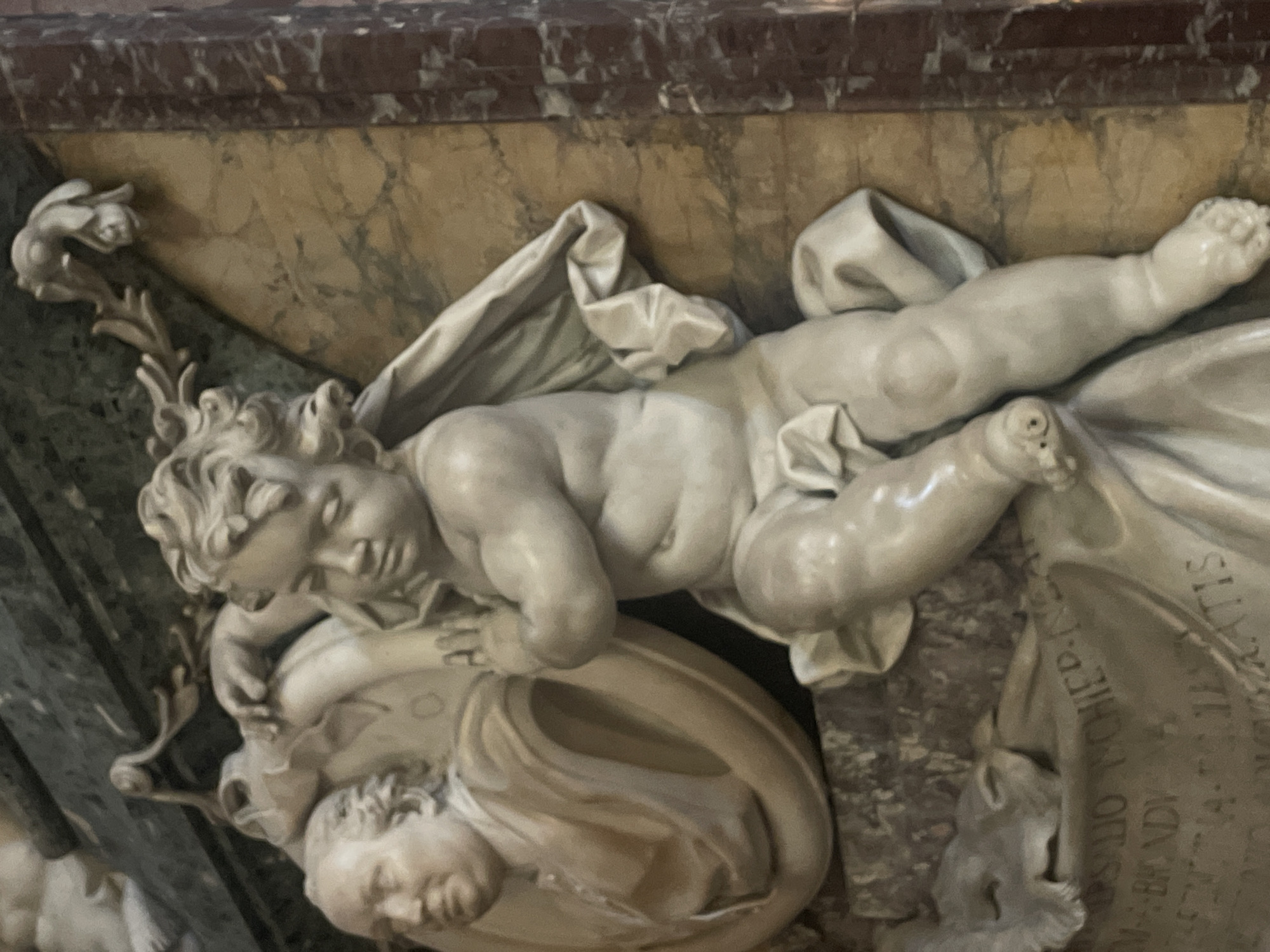 This image depicts a detailed marble sculpture of a cherubic figure in repose