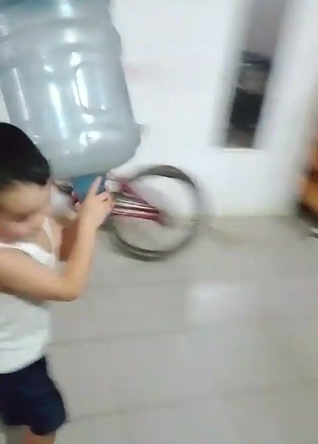 A young boy, appearing to be around 4 years old, wearing a white tank top and dark blue shorts, is struggling to carry a large, transparent water jug. He initially holds it up with his hands then puts it on his shoulder and nearly falls with it. Another older boy, shirtless, with grey pants and shoes enters the scene carrying cleaning supplies, which he uses to clean the floor. The scene is set indoors, with tiled flooring, white walls, and a wooden ceiling with exposed beams. A red bicycle and a grey motor scooter are also visible in the background. There is a wooden door at the far end of the room.
