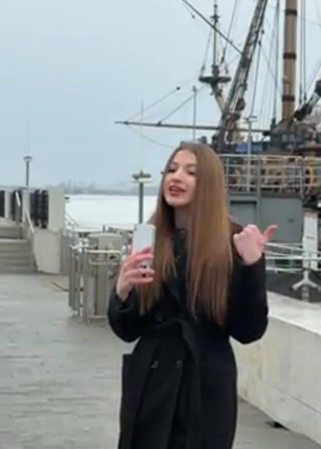 A young woman with long brown hair is standing on a paved walkway, speaking into her smartphone. She is wearing a long black belted coat. Behind her is a large, old-fashioned sailing ship with tall masts and rigging. To the left of the woman are gray concrete steps and a metal railing. The sky is overcast, and the background suggests a waterfront location. The woman gestures with her hands as she speaks, indicating the ship behind her.