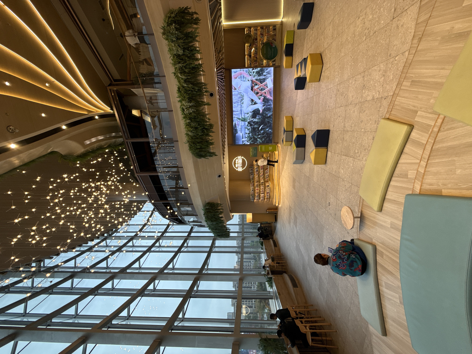 This image depicts a multi-level interior public space located in Liangjiang, China. A dominant, curved glass curtain wall spans the entire left side, revealing an urban cityscape with multi-story buildings under an overcast sky. The high ceiling features numerous small, warm-toned spherical lights suspended at various lengths, creating a diffused illumination pattern. An upper-level balcony is visible on the right, delineated by a glass railing, and adorned with substantial hanging green ferns. The balcony ceiling incorporates curved architectural elements with embedded linear strip lighting. On the main floor, a large digital display screen is centered on a wooden-paneled back wall, exhibiting an image of a person seated on a stool amidst plants. Flanking the screen are integrated curved wooden structures serving as bookshelves, stocked with various books. A male individual, wearing a light-colored shirt, stands near the left bookshelf, facing it. Along the base of the curved glass wall, a continuous wooden counter with multiple backless stools provides seating; at least three individuals are observed seated here, engaged with personal electronic devices or observing the exterior. In the foreground, a female individual, viewed from behind, is seated on a rectangular light green floor cushion. She wears a patterned teal sweater and dark pants, and is operating a mobile device held in her hands. A small, circular light-colored wooden side table is positioned to her right. The central floor area is tiled with light-colored, subtly patterned stone and is furnished with additional, scattered seating elements including rectangular floor cushions in light green and yellow, and numerous modular, geometric poufs in yellow, navy blue, and gray.