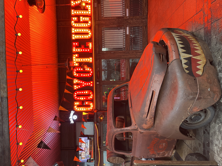 A weathered old pickup truck, its hood slightly ajar, sits beside a building. The truck's front has a stylized pattern resembling teeth. A bright neon sign reading "COYOTE UGLY" illuminates the scene vertically. Strings of lights add to the atmosphere. The building features a sign reading "BRISTOL SALOON" in the windows. Various decorations, including banners and barrels, are visible. The color scheme is dominated by orange and red hues.