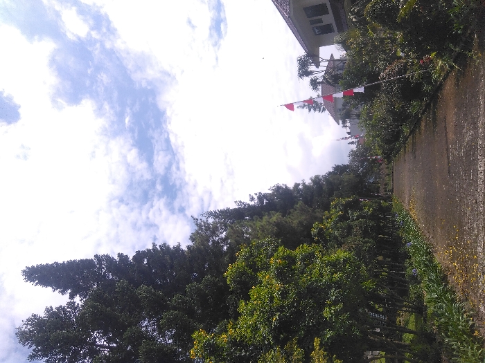 This image captures an outdoor pathway in Cipanas, Indonesia, extending into the distance under a partly cloudy sky
