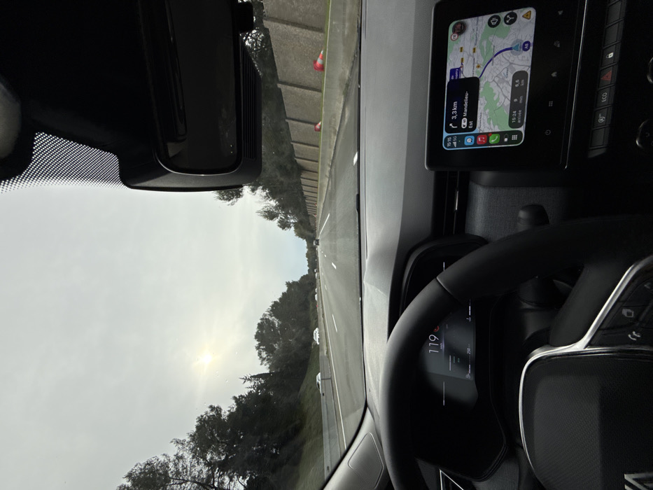 The image depicts a first-person view from the driver's seat of a vehicle traveling on a multi-lane highway, specifically the A8 autoroute in the vicinity of Mougins, France. The exterior scene shows a moderately trafficked highway under an overcast sky with a bright sunburst visible through the clouds. On the left, an embankment is densely covered with dark green trees. On the right, a tall, segmented beige sound barrier or retaining wall runs alongside the highway, with additional trees visible above it. Two red and white traffic cones are partially visible on the right shoulder, leaning against the base of the wall. Inside the vehicle, a modern dashboard with a dark, textured finish is visible. The digital instrument cluster, partially obscured by a black multi-function steering wheel with chrome accents, displays a speed of "119 km/h" and "250 km" (likely range). A central infotainment screen shows a navigation map indicating a destination of "Mandelieu-Est" 3.3 km away, with an estimated arrival time of "15:24" and the current time as "15:15." A "5G" signal icon is also present on the screen. The vehicle's interior rearview mirror is mounted to the windshield, which features a dotted sensor area behind it. No occupants are explicitly visible, but the driver's perspective implies operation of the moving vehicle.