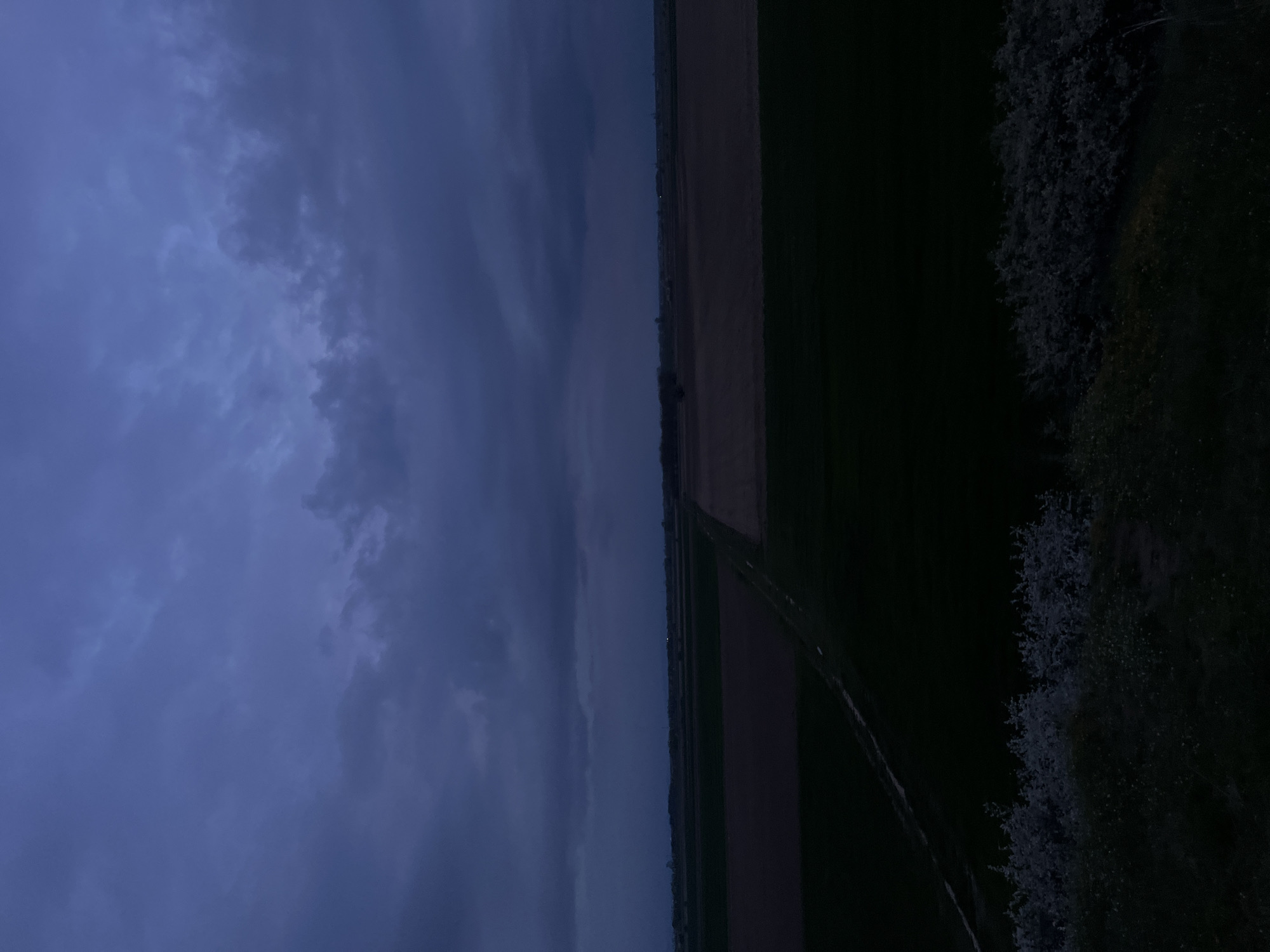 The image depicts a landscape near Trud, Bulgaria, under a stormy sky. Dark, ominous clouds dominate the left side of the image. To the right of the clouds, an agricultural field transitions from lighter brown sections to darker green and finally to almost black. A road or path runs along the edge of the field. The right side of the image consists of dark foliage, possibly trees or bushes. The overall scene is dimly lit, suggesting it is either dusk or dawn, or possibly a daytime scene obscured by the storm clouds.