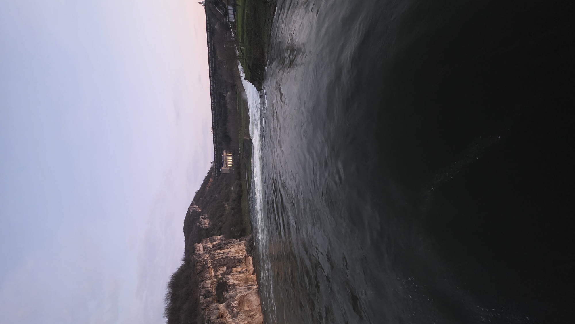 The photograph depicts a dam in Gorsko Kosovo, Bulgaria. The dark, turbulent water occupies the right side of the frame, contrasting with the rough, rocky cliffs on the left. A building, possibly related to the dam's operations, is visible atop the cliffs. Above it, a bridge spans the scene. The sky is pale, suggesting either dawn or dusk. The photograph is taken at an oblique angle, with the horizon appearing nearly vertical. There are no people visible in the image.
