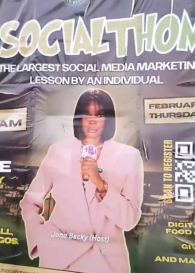 large banner for a "SocialThon" event attempting to set a Guinness World Record for "The Largest Social Media Marketing Lesson by an Individual". The banner features a woman identified as "Jona Becky (Host)" wearing a pink suit and holding a microphone with the "TRT" logo. The event is scheduled for Thursday, February 1st. A QR code is present for registration. Social media handles "@microphonegoddess" and "@thebeckyjoe" are displayed. The banner is partially obscured by what appears to be a crumpled transparent plastic sheet. The background of the banner includes images suggesting digital marketing, food and drinks, giveaways, games, and other activities. The environment seems to be outdoors, with what looks like ground visible below the banner.