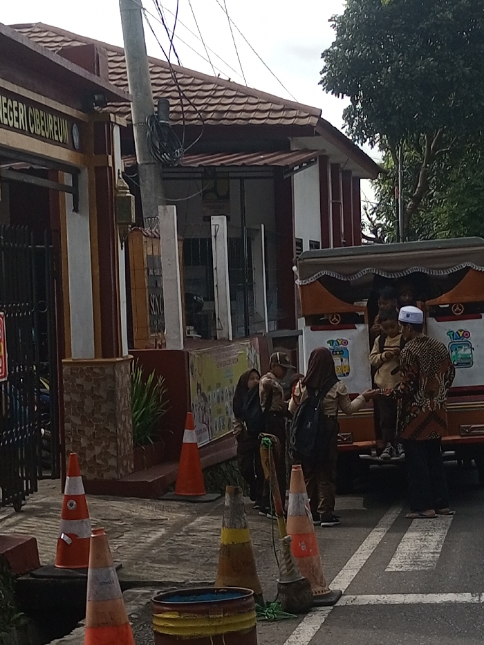 A group of children in school uniforms are exiting a van with "Tayo" printed on the side. A man in a batik shirt and white cap is assisting them. The scene occurs near a building with a sign that reads "NEGERI CIBEUREUM." Several traffic cones are scattered on the street, and there are trees visible in the background. The overall atmosphere suggests a school drop-off or pick-up scene.
