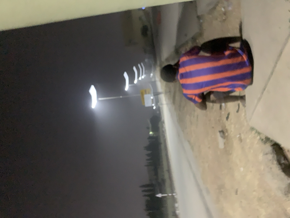 A person in a horizontally striped orange and purple shirt crouches on a sidewalk at night. Streetlights illuminate the road and the surrounding area. The sky is dark, and there are trees or bushes visible in the distance. The sidewalk is next to a paved road. The photo is taken at an angle, making the horizon appear slanted.