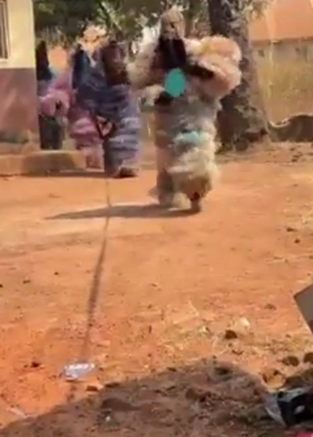 four costumed people walking across a dusty, outdoor, rural space. A building is in the background. The people are wearing elaborate, fur-like costumes of varying color patterns. They are walking away from the camera. There are objects scattered across the space, including a cardboard box, a blanket, and various small items.