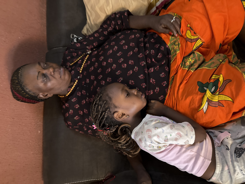 A grandmother and granddaughter rest on a brown sofa. The grandmother, wearing a black patterned shirt and orange patterned cloth, lies on her back. She has a yellow beaded necklace. A young girl in a pink shirt and patterned pants lies on her side, her head on the grandmother's chest. Both appear peaceful and relaxed. A beige pillow sits behind the grandmother's head. The wall behind them is a muted orange color.