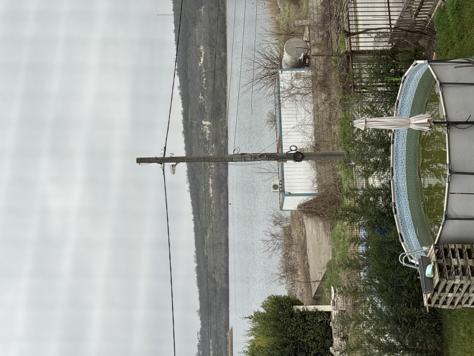 The image displays an outdoor scene observed from a raised vantage point in Strashimirovo, Bulgaria, overlooking a body of water, likely Lake Varna. In the immediate foreground, a circular, above-ground swimming pool is visible, containing stagnant, murky green water. A beige, closed patio umbrella stands upright within the pool. To the left of the pool, a stack of light-colored wooden pallets serves as a makeshift surface, upon which a dark rectangular planter and a light green plastic container are placed. The ground in this area is covered with green grass and several small evergreen bushes. A dark-colored metal fence runs horizontally across the lower midground, partially obscured by vegetation. The midground features a prominent concrete utility pole with several electrical wires attached, including a small, white street lamp fixture. Wires extend horizontally across the frame from this pole. Behind the utility pole, a rectangular, white and blue storage container, possibly a modified shipping container, is situated. An air conditioning unit is mounted on its side. To the right of this container, a large, horizontal cylindrical tank, grey in color, rests on the ground. The terrain in the midground is largely unkempt, with patches of dry, brown vegetation and exposed earth. The background is dominated by a wide expanse of calm, grey-blue water, consistent with a large lake. A single, small green navigational buoy is discernible on the water's surface, positioned towards the left-center. Beyond the water, a distant landmass consisting of rolling hills is visible, characterized by sparse deciduous trees and sections of exposed, light-colored soil. Small structures, possibly residential buildings, are visible on the far left hillside. The sky above is overcast, with uniform grey cloud cover. No individuals are present in the frame.