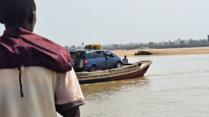 The image depicts a river crossing scene in Ibi, Nigeria. In the foreground, the upper back and right shoulder of an individual are visible from behind. This person has dark skin and wears an off-white garment with a patterned sleeve and a dark maroon-colored hood or cowl, from which a dark cord dangles. In the midground, a long, wooden boat, functioning as a ferry, navigates across a wide body of calm, brownish water, generating a small wake. The boat is carrying a blue minivan, positioned facing left. The minivan's rear tailgate is open, revealing items loaded within, and multiple yellow jerrycans are secured to its roof rack. A person is visible in the driver's seat of the minivan, and another dark-skinned individual stands towards the rear of the boat, partially obscured. The background shows the opposite riverbank, characterized by a sandy or dirt shoreline with sparse green vegetation and a small pile of logs or debris. The sky above is light and hazy.