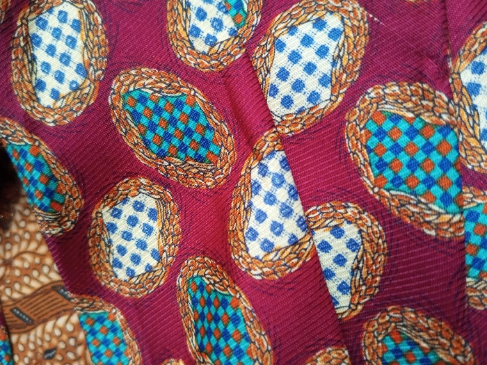 The scene, located in the city of Ciherang, Indonesia, presents a close-up view of two distinct textile patterns. The dominant fabric, occupying most of the frame, is a deep reddish-purple with a fine, horizontally ribbed texture and several visible creases. This fabric features a repeating pattern of oval-shaped motifs. Each oval is framed by a golden-brown, braided or woven border. Inside these borders, two alternating sub-patterns are observed: one consists of uniformly spaced small blue dots on an off-white background, and the other is a checkerboard arrangement of small teal and orange-brown squares. A second, light brown fabric with a repeating darker brown organic pattern is partially visible in the lower-left section, positioned beneath or adjacent to the dominant fabric. No individuals or other objects are present, and the background is obscured by the textiles.
