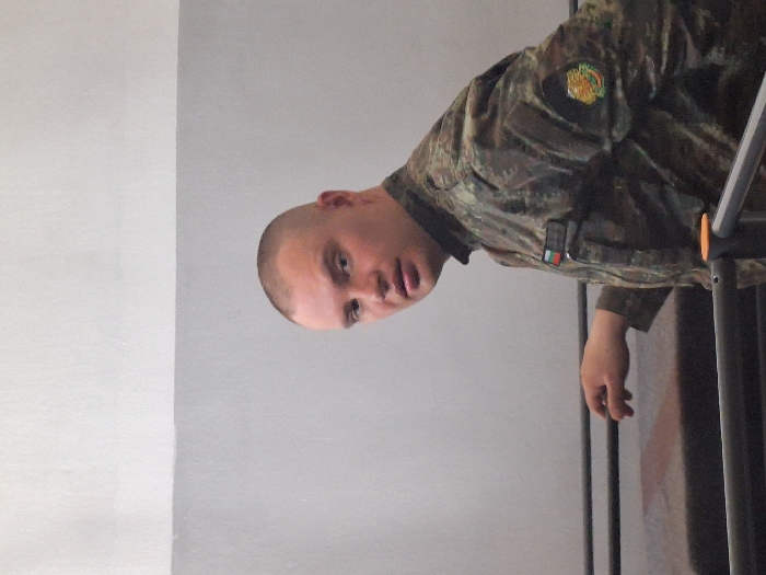 A male individual with a shaved head is depicted from the mid-torso up, looking directly at the viewer. He wears a pixelated camouflage uniform. On his left chest, a patch resembling the Bulgarian flag (white, green, red vertical stripes) is visible, accompanied by a small black rectangular badge below it. A circular patch displaying the Bulgarian coat of arms, featuring a crowned golden lion rampant, is present on his left shoulder. His right hand rests on a dark horizontal metal railing, which is part of a multi-bar barrier system in the foreground. An orange cap or stopper is attached to a lower railing on the right. The background consists of a plain wall, horizontally divided into an upper light grey/white section and a lower medium grey section. Below the railings, a dark surface with a reddish-brown linear marking is partially visible. Given the uniform insignia, the scene is located within an institutional setting in Sofia, Bulgaria, likely a facility associated with the Bulgarian armed forces or other state security entities.