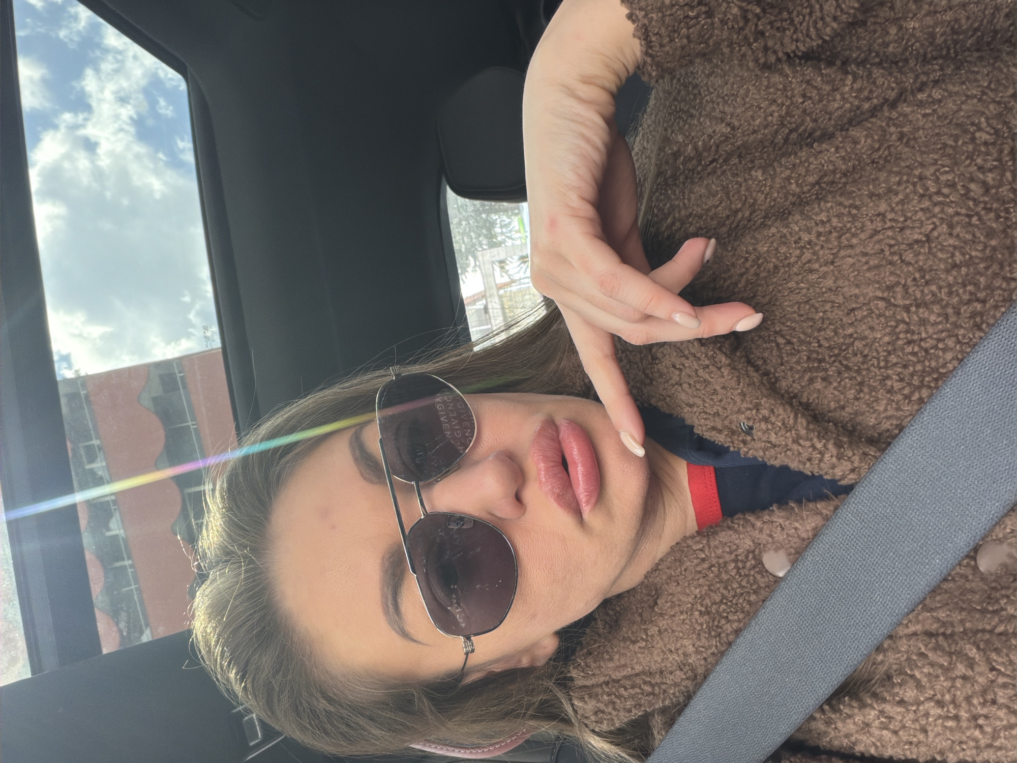 A close-up selfie depicts a female individual seated within a dark-interior vehicle, secured by a grey seatbelt across her chest. She wears a brown, textured, fuzzy coat over a visible navy blue garment with a red collar. Aviator-style sunglasses with "GIVENCHY" branding on the right lens obscure her eyes. Her lips are full and positioned in a slight pout. Her right hand is raised, with the index finger extended towards her chin; her nails are manicured with a light polish. An open sunroof above reveals a partly cloudy blue sky. A strong rainbow-colored lens flare is present in the upper left quadrant of the image. Through the vehicle's windows and the sunroof opening, a multi-story building with reddish-brown walls, balconies, and a tiled roof is partially visible, consistent with typical urban architecture found in Tirana, Albania. The scene takes place in a city environment during daylight hours.