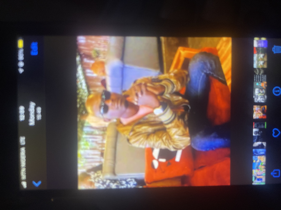 The image displays a photograph captured from a digital screen, likely a smartphone. The screen's status bar indicates "MTN NIGERIA LTE," "12:08," "Monday," "15:49," and a "90%" battery level with an "Edit" option. Below the primary image, a gallery thumbnail strip is visible along with standard mobile interface icons for sharing, favoriting, information, and deletion. The central subject of the displayed photograph is a male individual, appearing bald or with very short hair, seated in what is identified as a location within the city of Bukuru, Nigeria. He is wearing dark sunglasses, a light pink or peach-colored crew-neck shirt, and a reflective, metallic gold or bronze jacket with ribbed, striped cuffs. His lower attire consists of dark blue jeans. A prominent watch with a light-colored face is on his left wrist, and a ring is visible on his right hand. A gold-colored earring is present in his left ear. His hands are clasped together in front of him, resting near his lap. He is seated on a reddish-orange armchair or sofa. To his immediate left, a reddish-orange cushion with a partial black and white design is visible. The background is somewhat blurred, featuring additional furniture, including what appears to be a light purple or gray sofa to his right. Other indistinct figures are present further in the background, suggesting a social environment such as a lounge or restaurant. Elements resembling vertical wooden slats or paneling and blurred green foliage or decorative plants are visible in the upper background.