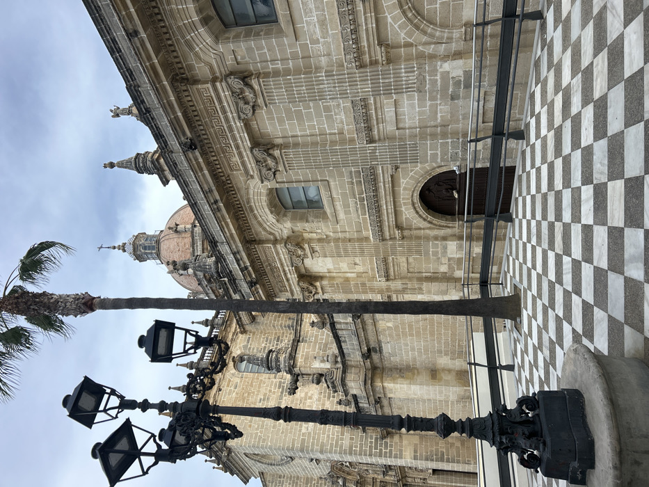 The image depicts an exterior view of the Jerez Cathedral (Catedral de San Salvador) in Jerez De La Frontera, Spain, under an overcast sky. In the immediate foreground, to the left, stands a tall, ornate black cast-iron lamppost featuring three lantern-style lights, set on a circular concrete base. Adjacent to the lamppost, a slender palm tree with a dark trunk rises vertically. The ground area in the foreground and midground is paved with a distinctive black and white checkered pattern made of square tiles. A dark metal railing, composed of horizontal bars and vertical supports, separates this tiled area from a lower section and runs parallel to the cathedral facade, with a gentle slope towards the right. The central and background subject is the cathedral itself, constructed from light-colored stone masonry, displaying classical architectural elements. The facade features multiple arched windows, decorative pilasters with ornate capitals, and horizontal friezes adorned with a geometric meander pattern. The upper roofline exhibits several pinnacles and at least one small statuette, possibly an angel. Towards the top center, a large, reddish-brown tiled dome with a lantern structure and a cross finial is visible. A dark wooden arched door is situated on the lower right portion of the visible facade, featuring carved or relief elements, possibly depicting figures. No people, discernible actions, or interactions are present in the scene.