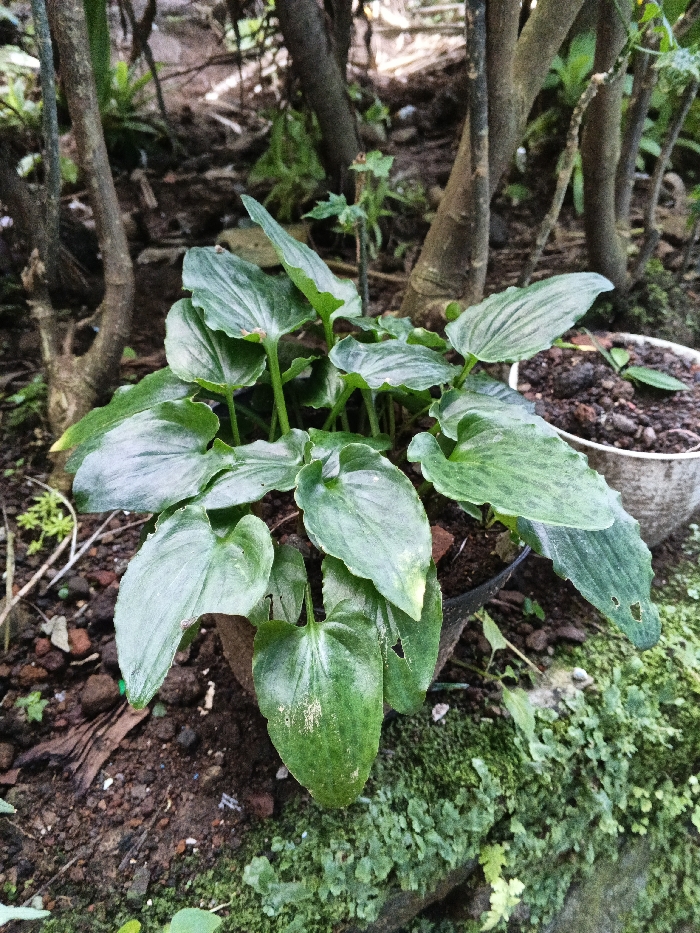 The image displays an outdoor horticultural scene located in Bien Hoa, Vietnam. The central subject is a robust cluster of broad-leaved plants, likely a Hosta species, exhibiting numerous dark green, elliptical to heart-shaped leaves. Several leaves show lighter green sections, yellowish discoloration, or small perforations consistent with minor insect damage. This plant appears to be contained within a partially visible black plastic pot. To the immediate right, a light-colored, textured pot, possibly ceramic or concrete, contains dark soil and a single, small green sprout. The ground beneath and around the central plant consists of dark brown soil intermixed with reddish-brown fragments and small stones. A vibrant patch of light green moss or small fern-like groundcover is visible on the lower right, adhering to a slightly elevated surface. The background is dominated by multiple tree trunks and branches of varying thicknesses, suggesting a dense canopy or wooded area. No individuals, animals, or dynamic actions are present in the static scene. The environment is naturally lit.