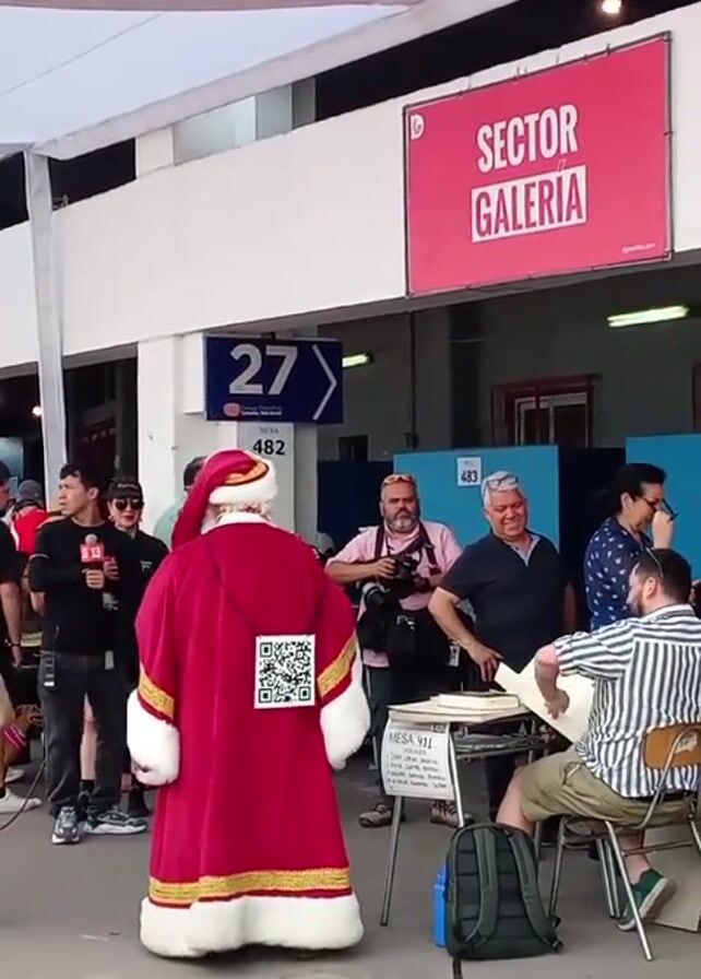 A man dressed in a Santa Claus costume, complete with a large QR code on his back, stands in front of a table where people are signing up to vote. He appears to be garnering attention, with several people including photographers and a reporter with a microphone surrounding him. The scene is outdoors under a white awning, with signs indicating voting table numbers. A large sign reading "SECTOR GALERÍA" is visible in the background. The atmosphere seems casual and engaged as individuals interact with the Santa figure and the voting registration process.