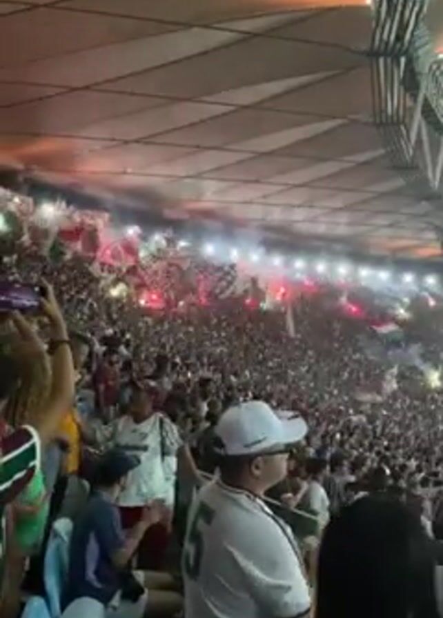 The camera pans around inside a large stadium filled with people. Many individuals are wearing white or maroon athletic jerseys or shirts. Some people are clapping and cheering, while others are holding up their phones to record the scene. In the background, a large section of fans is visible with flags and red flares in the air. The stadium has a ribbed, silver roof. The lighting is bright, and the colors are vivid. The scene appears to be an enthusiastic gathering of sports fans.