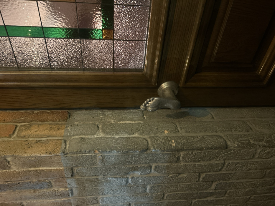 The image displays an interior scene in Dnipro, Ukraine, focusing on a junction between a textured wall and a wooden door. The wall exhibits a brick pattern, with the upper section rendered in reddish-brown tones and the lower section in grey, separated by a distinct horizontal demarcation. Adjacent to this wall stands a dark brown wooden door, featuring recessed panels and a large central insert of textured, frosted glass. The glass is segmented by a grid pattern, with a prominent vertical strip and a smaller square section displaying a vibrant green hue, while other sections appear in shades of reddish-purple or amber, suggesting stained glass elements. A unique silver-colored door handle, sculpted in the distinct form of a human foot, complete with toes and an ankle, is affixed to the wooden door frame by a circular escutcheon plate. No individuals, actions, or interactions are visible within the frame.