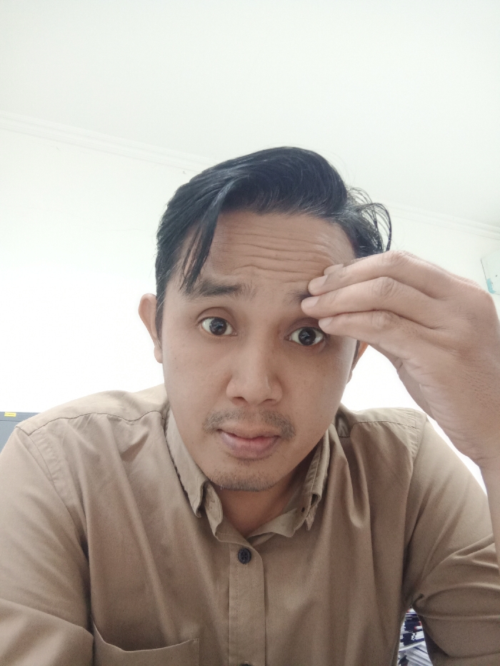 An Asian man looks directly at the camera with a concerned expression. He wears a light brown button-down shirt. His hair is black and styled back. His right hand is touching his forehead, partially obscuring it. The background is a plain white wall. The scene appears to be indoors, possibly an office setting.