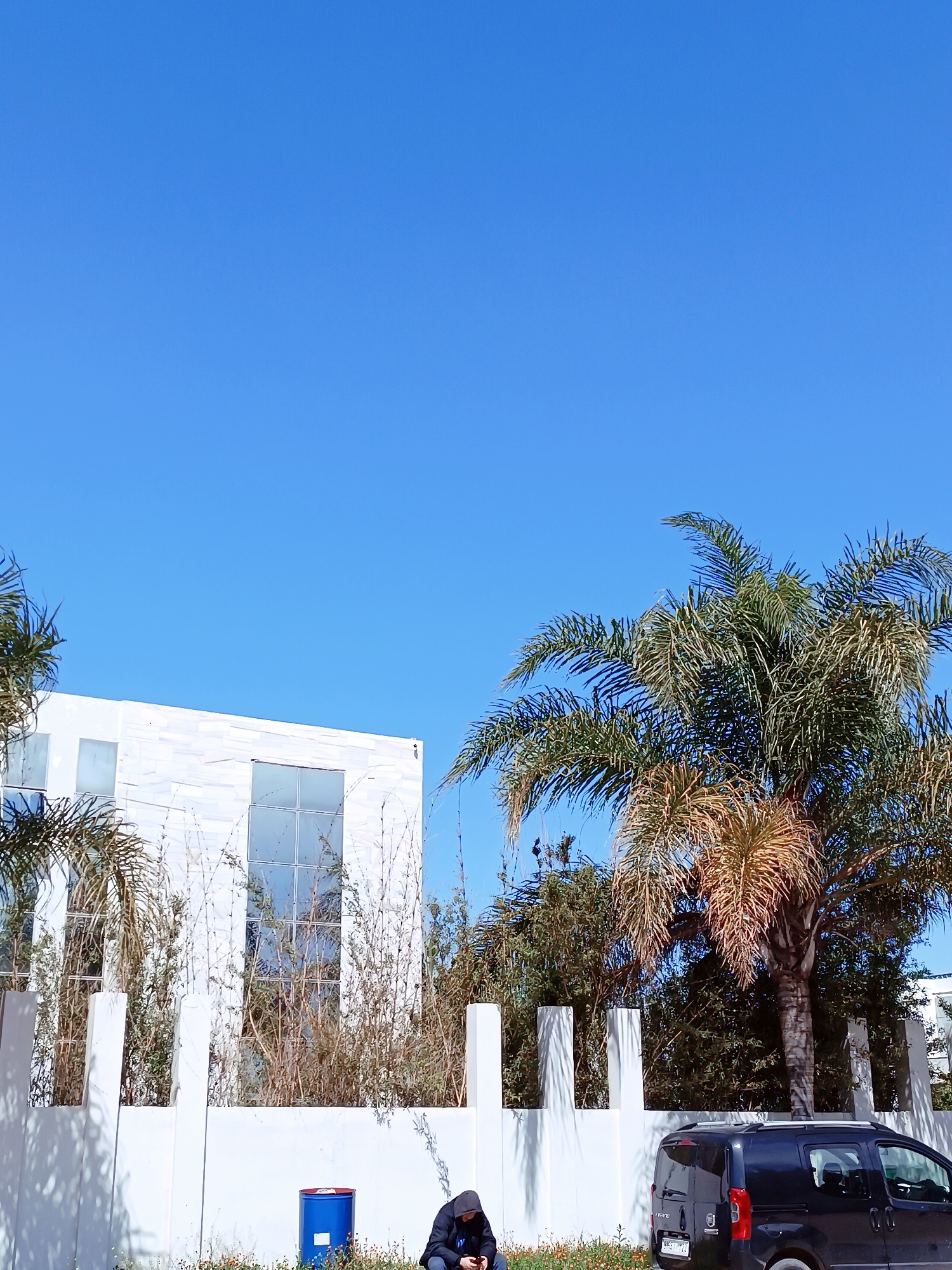 This image depicts an outdoor scene in Majjate, Morocco, under a clear, bright blue sky. A modern, white-tiled building with large reflective windows is visible in the background, partially obscured by tall, dry vegetation and a segment of a white concrete wall acting as a perimeter fence. In the foreground, a single individual is seated on the ground beside the white wall, positioned towards the lower left. This person is wearing a dark hooded jacket with the hood up, obscuring their face as they look downward, appearing to interact with a small electronic device held in their hands. Adjacent to this individual, a blue barrel with a red lid rests on the ground. To the right, a dark-colored minivan or utility vehicle, possibly black or dark grey, is parked on what appears to be a street or roadside. Its rear is visible, showing a license plate and roof rails. A large palm tree with both green and partially dried fronds stands prominently behind the vehicle and the white wall, casting shadows onto the wall. Other foliage and trees are visible behind the wall and palm tree. The scene is illuminated by strong sunlight, indicative of daytime.