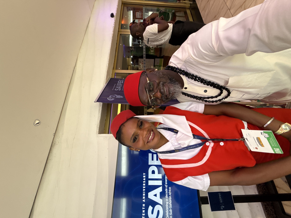 A forensic description of the image reveals a medium shot of two individuals posing for a selfie in an indoor setting, likely a convention center or event hall, in Itirin, Nigeria. In the foreground, a woman on the left, with dark skin, dark hair, and a smile, wears a red beret-style hat with a white drape, a white short-sleeved shirt, and a red vest with white trim. A black lanyard with a white ID badge, featuring a "Happy Anniversary" cake graphic, text, and a QR code, hangs around her neck. She wears a silver bracelet and a gold watch on her left wrist. To her right, a man with dark skin, a grey beard, and a smile, wears a red cylindrical hat, gold-rimmed glasses, and a white long-sleeved traditional-style shirt adorned with multiple black beaded necklaces. He holds a device, presumably a camera or phone, extended to capture the image. The background features event signage. To the left, a large blue display screen or banner shows "TENTH ANNIVERSARY," "SAIPEC," and text indicating "Celebrating a decade of energy in Sub-Saharan Africa." Below it, a smaller black sign also bears the "SAIPEC" logo. Centered in the mid-ground, a purple banner displays the "SAIPEC" logo. To the far right, partially visible through reflective glass doors, a third man with dark skin, wearing a light-colored t-shirt, holds an infant or toddler. The doors have white lettering, including "IKO." The environment includes a light-colored ceiling with recessed lighting and a polished floor.
