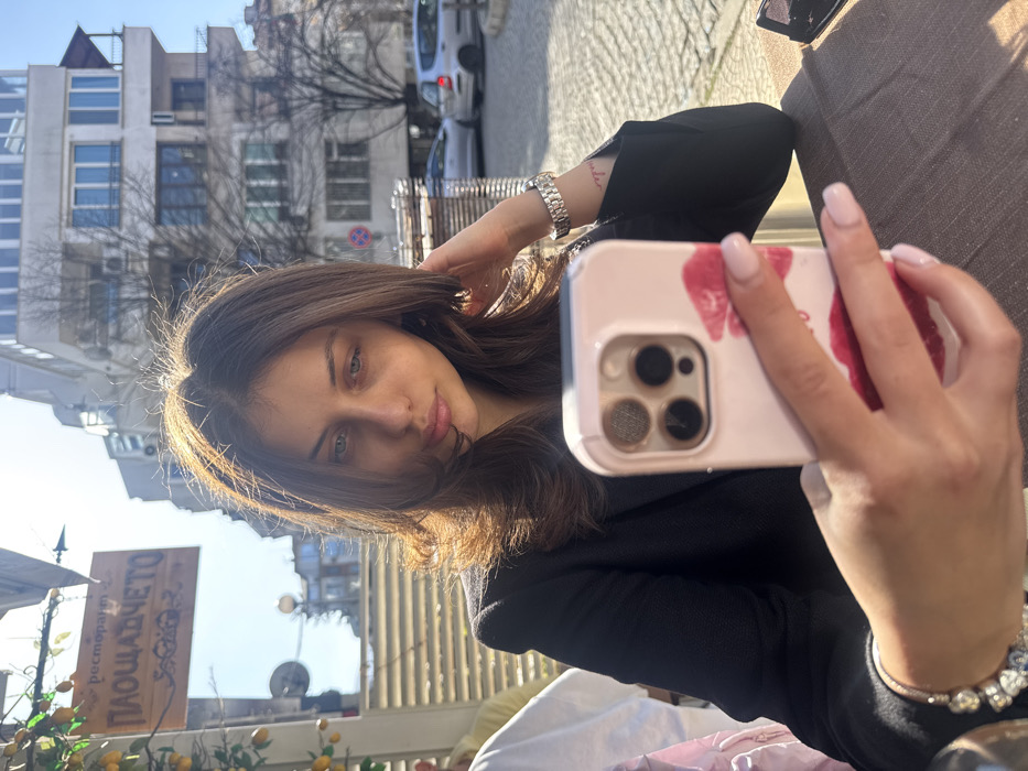 A young adult female is depicted in a close-up, seated at an outdoor cafe or restaurant on a sunny day in Sofia, Bulgaria. She has long, dark brown hair, light-colored eyes, and wears a dark blazer. Her left hand is resting near her hair, displaying a silver-colored watch with a metal band and a charm bracelet on her wrist. A small tattoo, appearing to be text, is visible on her left forearm. Her fingernails are manicured with light pink polish. In her right hand, held at chest level, she grasps a light pink smartphone with a distinct triple-camera module (consistent with an iPhone 13 Pro or 14 Pro). The phone case features multiple red lip prints. Her gaze is directed towards the smartphone, suggesting she is interacting with the device, possibly taking a selfie or engaging in a video call. To the left, out of focus, a portion of another person in a light-colored garment is visible. The immediate foreground features a brown, textured table surface. Behind the subject, a wooden sign hangs, bearing the Cyrillic text "ресторант ПЛОЩАДЧЕТО" (Restaurant Ploshtadcheto), which identifies the location as the Ploshtadcheto restaurant, specifically at ul. "Tsar Ivan Shishman" 28, 1000 Sofia Center, Sofia, Bulgaria. The sign is adorned with artificial lemon branches. The background reveals an urban environment under clear skies. Multi-story buildings with various windows and balconies are present. A street with several parked cars, including a silver hatchback, is visible. Bare trees and a red circular street sign on a pole complete the background elements, indicating an outdoor, street-side setting.