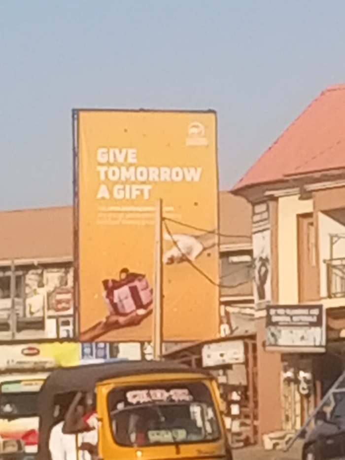 This image depicts a daytime urban scene in the city of Sardauna, Nigeria. A prominent vertical billboard, positioned centrally, features a yellow-orange background with the white text "GIVE TOMORROW A GIFT." An illustration on the billboard shows a dark-skinned hand holding a pink gift box with dark ribbons, while a lighter-skinned hand is visible higher up. A utility pole with multiple dark wires crosses in front of the billboard. To the right of the billboard, a multi-story building with a reddish-orange tiled roof, light-colored walls, and dark brown architectural trim is partially visible. Another building with a flatter roofline is discernible behind the left side of the billboard. In the foreground, a yellow auto-rickshaw (Keke Napep) is present, with a person, presumably the driver, visible within the vehicle. A portion of a white vehicle, likely a bus, is visible on the far left. The overall environment suggests an active commercial or residential street.