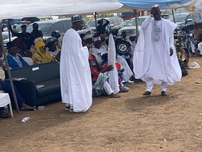 An outdoor gathering in Abobo, Nigeria, is depicted under a white canopy on reddish-brown dirt ground
