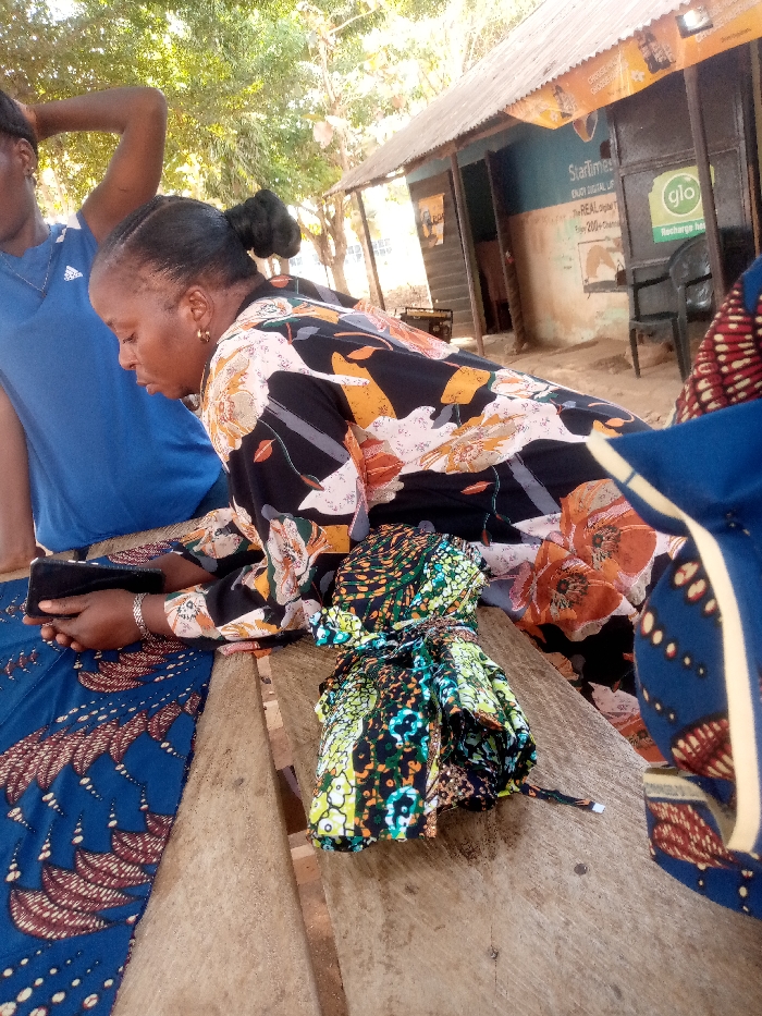 The image depicts an outdoor scene in Maigizo, Nigeria, featuring three individuals and a commercial storefront. In the foreground, a woman with dark skin, her hair in a bun, leans over a light-colored wooden surface. She wears a long-sleeved black, white, orange, and yellow floral patterned shirt, gold hoop earrings, and a silver bracelet on her left wrist. She is focused on a black smartphone held horizontally in her left hand, with her right hand also resting on or near it. In front of her, on the wooden surface, lies a piece of blue fabric with a brown feather-like pattern, and to her right, a bundle of green, black, yellow, and orange patterned fabric, tied. To the left of the central woman, partially visible, is another person wearing a blue t-shirt with a white Adidas logo. A third person's blue and red patterned clothing is visible on the far right. In the mid-ground, a weathered building with a corrugated metal roof stands on a dirt ground. The building's wall is blue-grey with peeling paint, displaying "StarTimes" and "GLO" advertisements. A black plastic chair is positioned in front of the building. Trees with green foliage are visible in the background under natural daylight.