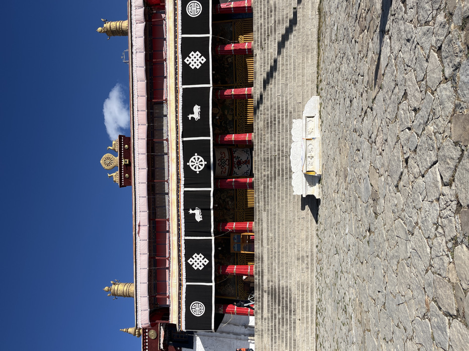 This image depicts the facade of a large Buddhist monastery building, specifically identified as Sera Monastery (Sera Thekchenling), located in Chengguan District, Lhasa, Tibet Autonomous Region, China. The scene is dominated by the monastery's main building, characterized by multiple tiers, red and white walls, and a prominent roofline featuring golden decorative elements. The highest visible roof section includes a golden Dharma wheel flanked by two golden deer, with additional golden cylindrical finials on other roof sections. Below the roofline, an upper story with dark window frames is partially visible. The main entrance area features a series of prominent red pillars. Suspended across the front of this section are five black fabric banners, each adorned with white embroidered Buddhist symbols: from left to right, a circular auspicious cloud-like symbol, an Endless Knot, a stylized deer, a Dharma wheel, another stylized deer, another Endless Knot, and another circular auspicious cloud-like symbol. A wide, symmetrical flight of grey stone steps leads up to the monastery's entrance from a paved forecourt. The forecourt is constructed from irregular grey flagstones. Centered on this forecourt, directly in front of the staircase, is a white stone structure, possibly an offering table or altar, featuring carved motifs. A piece of yellow fabric is draped over its front-right corner, and it casts a distinct shadow to its left. Two individuals are partially visible on the left side of the staircase, ascending towards the building. Both are wearing dark clothing; one is further up the stairs, and the other is closer to the bottom, partially obscured. The sky above is clear and vibrant blue, with a single small white cloud visible above the right side of the building's roof. Strong natural light indicates a sunny day, casting sharp shadows from the stone structure on the forecourt and implied shadows from the building.