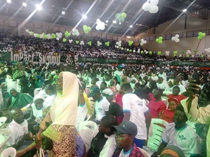 This image depicts a densely populated indoor event held in a large hall or arena in Ushapa, Nigeria