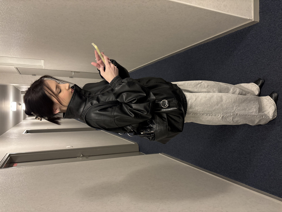 A young adult female is depicted standing in the center of an indoor hallway, looking down at and interacting with a yellow-cased smartphone held in both hands. She wears a black high-neck bomber jacket, light grey wide-leg trousers, and black flat shoes. A black shoulder bag with metallic rings and a buckle is slung over her left shoulder. Her dark hair is pulled back with a leopard print claw clip. The hallway features textured light-colored walls, a dark blue carpeted floor, and multiple light-colored doors along its length; one door on the left shows a red rectangular indicator. Overhead lighting fixtures are visible further down the corridor. No specific visual identifiers are present in the image to confirm the location as Cachan, France.