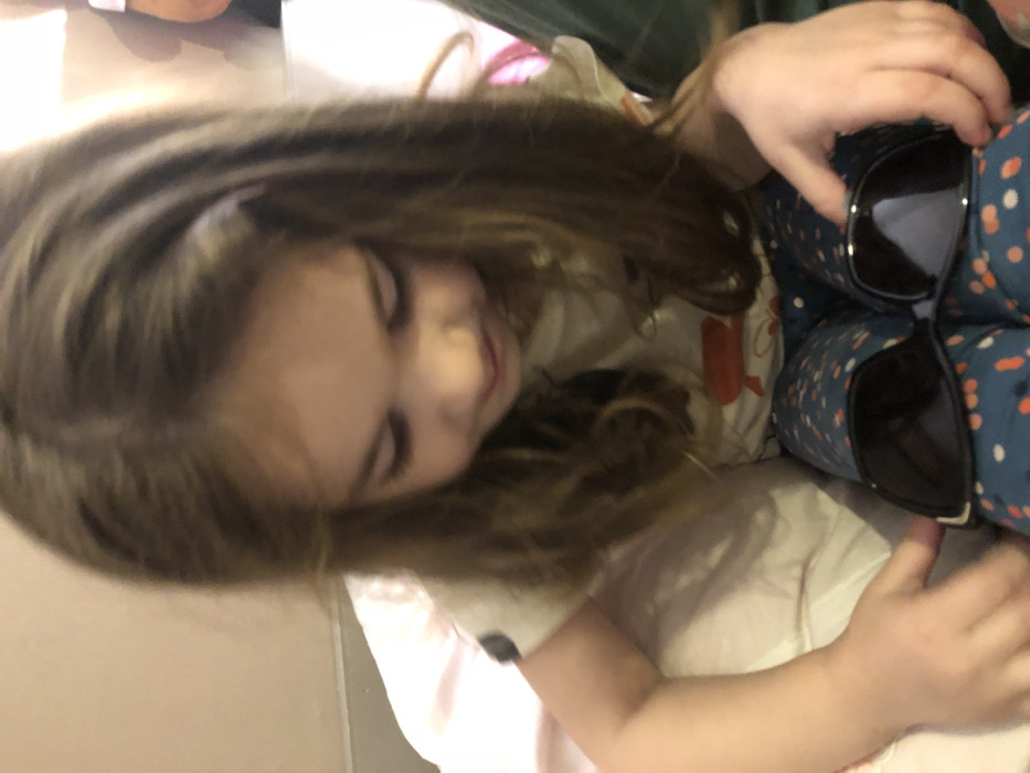 A young child with long, brown hair is depicted from a high-angle perspective, looking downwards. The child is wearing a light-colored t-shirt with a graphic on the front and dark blue trousers patterned with small, multi-colored dots. Both hands are positioned on either side of a pair of dark-framed sunglasses, which rest horizontally across the child's lap. The sunglasses feature dark lenses. The background is out of focus, showing indistinct light-colored surfaces to the left and partially obscured elements to the right. The scene is located in Saverne, France.