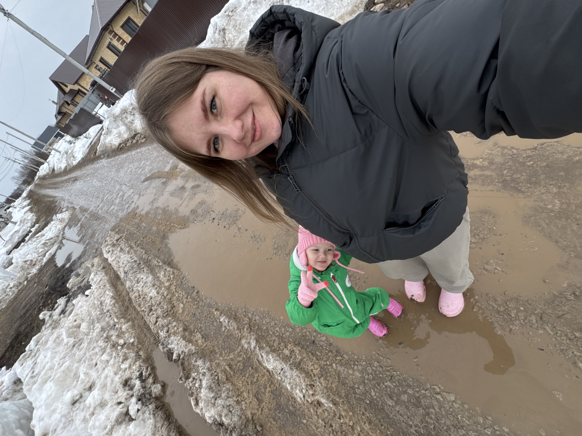 A selfie image depicts an adult female and a young child situated on a muddy, unpaved road in Горный, Russia, during what appears to be a thawing winter or early spring day under an overcast sky. The adult, in the foreground and on the right, is a fair-skinned female with light brown hair and blue eyes, smiling directly at the camera. She is wearing a dark grey puffer jacket, light grey pants, and pink boots, with her feet partially submerged in a mud puddle. To her left, slightly behind and below, stands a toddler wearing a bright green full-body snowsuit, a pink knitted beanie, pink gloves, and pink boots. The child is also in a mud puddle, looking towards the camera and extending the index and middle fingers of her right hand in a "V" gesture. The environment consists of a dirt road heavily saturated with water, forming numerous large, shallow mud puddles and exhibiting tire tracks. Significant accumulations of dirty, melting snow are piled along both edges of the road. In the background, several two-story residential buildings with light-colored brick exteriors and dark brown pitched roofs are visible, separated by dark brown corrugated fences. Utility poles with overhead wires line the street. The overall sky is uniformly grey.