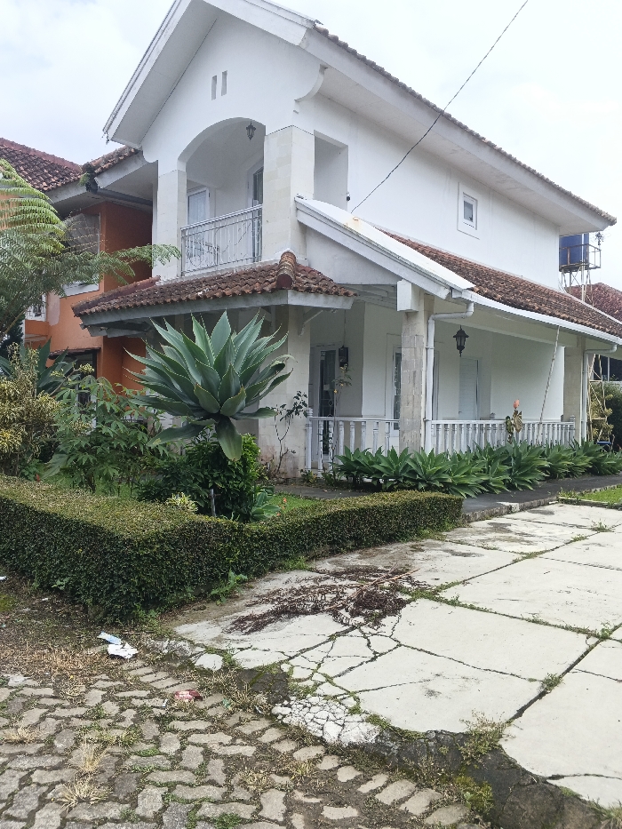 The scene captures a two-story residential building, purportedly located in Pô Kô, Vietnam, under an overcast sky. The primary structure features a white facade and a reddish-brown tiled roof. The second story includes an arched balcony with a silver-colored metal railing. The ground floor presents a covered porch supported by white columns and enclosed by white balustrades, with a dark wall-mounted lantern visible. In the foreground, a concrete paved area exhibits extensive cracking and is partially overgrown with grass and weeds. Sections of the paving consist of square slabs, while an area to the left features interlocking pavers. Dry plant debris is scattered across the cracked pavement, and a small piece of white and red litter is visible on the interlocking pavers. Adjacent to the paved area, a manicured green hedge forms a boundary for a garden. Within the garden, a large, prominent agave-like succulent plant with broad green leaves stands centrally. Smaller agave-like plants line the perimeter of the front porch. Various other green foliage is also present in the garden space. To the left of the main white building, a portion of an orange-colored house with a tiled roof is visible. To the right, in the background, a blue water tank mounted on a metal stand is discernible. No individuals are present in the image.
