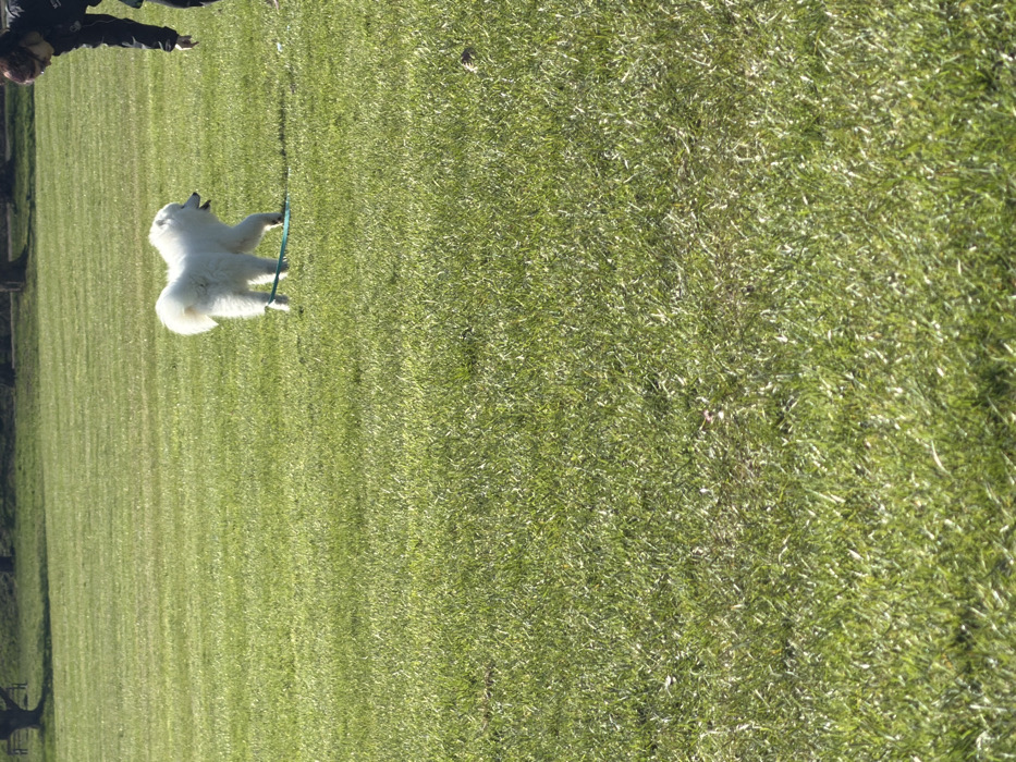 The image depicts an outdoor scene within a mown, green grassy field in Maidstone, United Kingdom. A white, fluffy Samoyed-type dog stands in the mid-ground, facing left, with its mouth slightly open. A light blue leash is visible around the dog's neck, extending towards the ground. To the immediate right of the dog, an individual is partially visible, bent forward and facing the dog. This individual, appearing female, has dark hair and wears a dark jacket, with their right arm extended downwards. The foreground and mid-ground consist of well-maintained short green grass. A distant treeline is visible in the background under bright natural lighting.