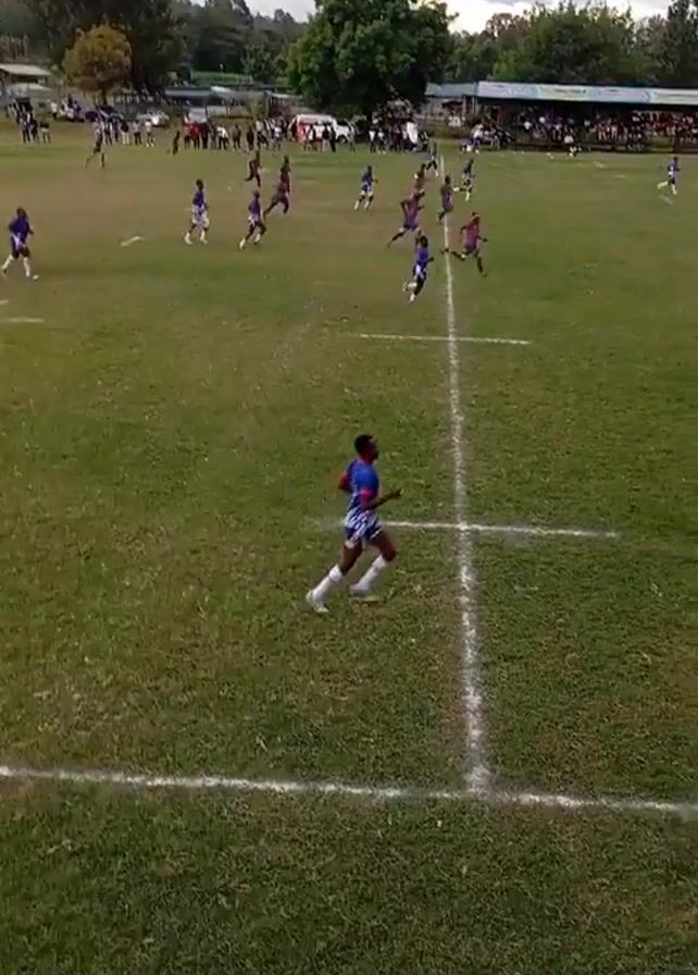 rugby match in progress on a grassy field. Players in blue and purple uniforms are running across the field. A group of spectators can be seen watching from the sidelines, and vehicles are parked nearby. Trees and buildings are visible in the background. The sky is overcast. A player in a blue and purple uniform runs towards the edge of the screen.