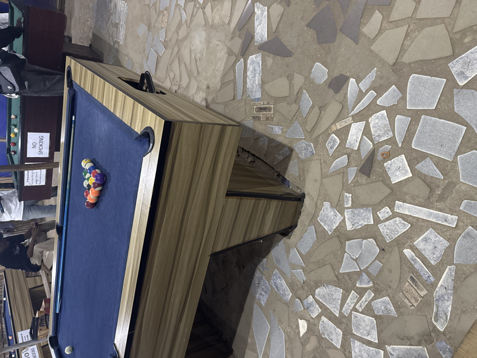 A billiard table with balls racked at one end dominates the frame. The table has a blue felt surface, wood-grain trim, and dark pockets. A cue stick lies on the table. The floor is a mosaic of irregular stone or tile pieces. Another billiard table and a "NO SMOKING" sign are visible in the background. People stand near the tables in the dimly lit room.