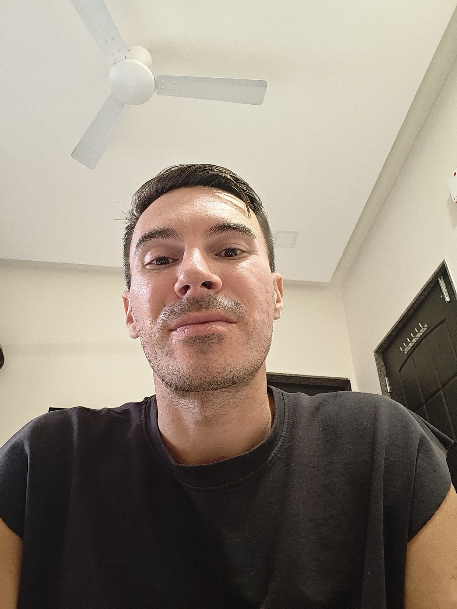 The image displays a head-and-shoulders selfie of a male individual, estimated to be between 25 and 45 years old, with short dark hair, a light complexion, and short stubble on his face. He is wearing a dark grey or black t-shirt and looks directly at the camera with a neutral expression. The background indicates an indoor setting in Kolhapur, India. A white three-bladed ceiling fan is visible in the upper center of the frame against a white ceiling. The walls are a light, off-white color. To the subject's right, a dark brown or black paneled door with a dark, possibly granite, frame is partially visible. This door features a metallic door handle and a row of approximately five to six metallic coat hooks mounted on its upper panel. Above the door, a small, square, recessed panel is present on the ceiling. A red object, possibly a fire alarm pull station, is partially visible on the far right wall, above the door frame. A dark, undefined object is partially visible behind the subject's left shoulder. The specific location within Kolhapur is not discernible from the provided visual information.