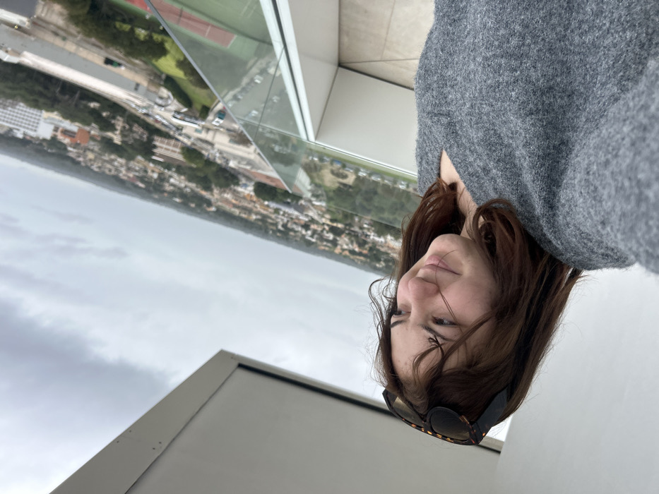 The image captures a young female positioned on an elevated balcony in Les Meravelles, Spain, against a panoramic cityscape. The female, in the foreground, has shoulder-length dark brown hair and is wearing a grey textured sweater. Tortoiseshell-patterned sunglasses are resting on top of her head. Her face is directed towards the camera, exhibiting a slight smile. Behind her, a clear glass railing with a white frame borders the balcony, offering a view of a dense urban environment under an overcast sky. The cityscape includes numerous buildings of varying sizes, roads, and interspersed green areas. Specifically, a sports complex with at least two red-surfaced tennis courts and a green field is visible in the mid-ground. The balcony floor is a light-colored, possibly tiled, surface.
