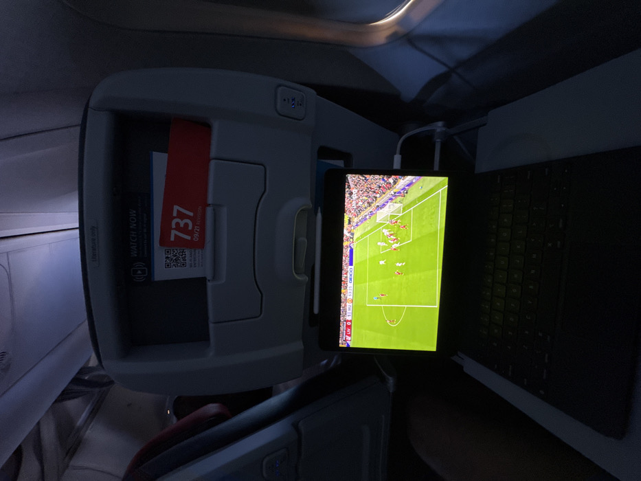 An airplane cabin interior is observed from a passenger's perspective. The location in the city is Unknown, Unknown. In the foreground, a dark laptop rests on a tray table, its screen brightly displaying a live soccer (football) match between Liverpool (LIV) and Manchester United (MNU), showing a score of 0-1 at 53:23 game time, with "GEICO" visible as a sponsor. A white charging cable extends from the laptop to a USB port on the lower right of the seatback directly ahead. This seatback features a literature pocket containing "WATCH NOW" signage, a QR code for Wi-Fi and entertainment, and a red tag marked "737 09/21 REVISION". A passenger's legs are partially visible in the lower-left corner, indicating interaction with the laptop. The cabin environment is dimly lit, with an overhead panel visible at the top and a dark exterior seen through a window on the right.