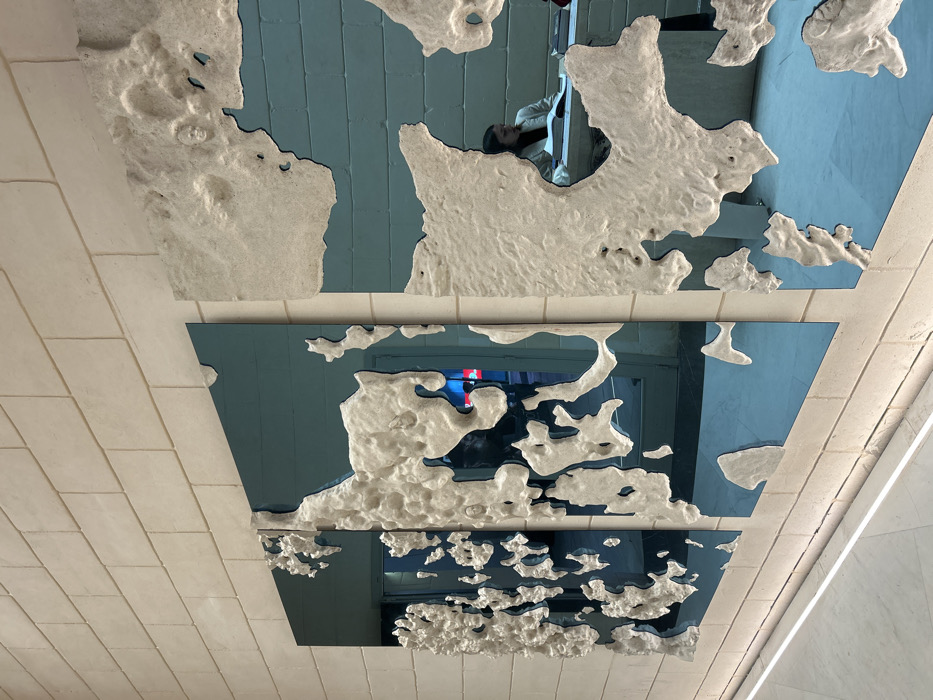 Three rectangular, blue-tinted mirrors are arranged sequentially on a ceiling with textured, white borders resembling clouds. The ceiling itself is composed of beige bricks laid in a horizontal pattern. Reflections within the mirrors show parts of the surrounding environment. A woman is visible in the reflection of the top mirror. The reflective surfaces and cloudy borders create a surreal, artistic ceiling installation.