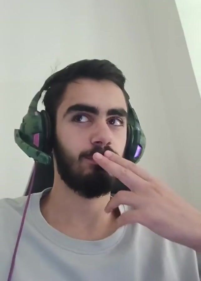 A man wearing headphones and a light gray t-shirt is seated in a chair. He is fair-skinned with a beard and dark hair. He holds up one finger and wags it. The camera lens then shows a reflection in a mirror, showing the same man now wearing a green t-shirt and glasses. He is seated at a desk with electronic equipment, and holds up one finger while giving the middle finger.