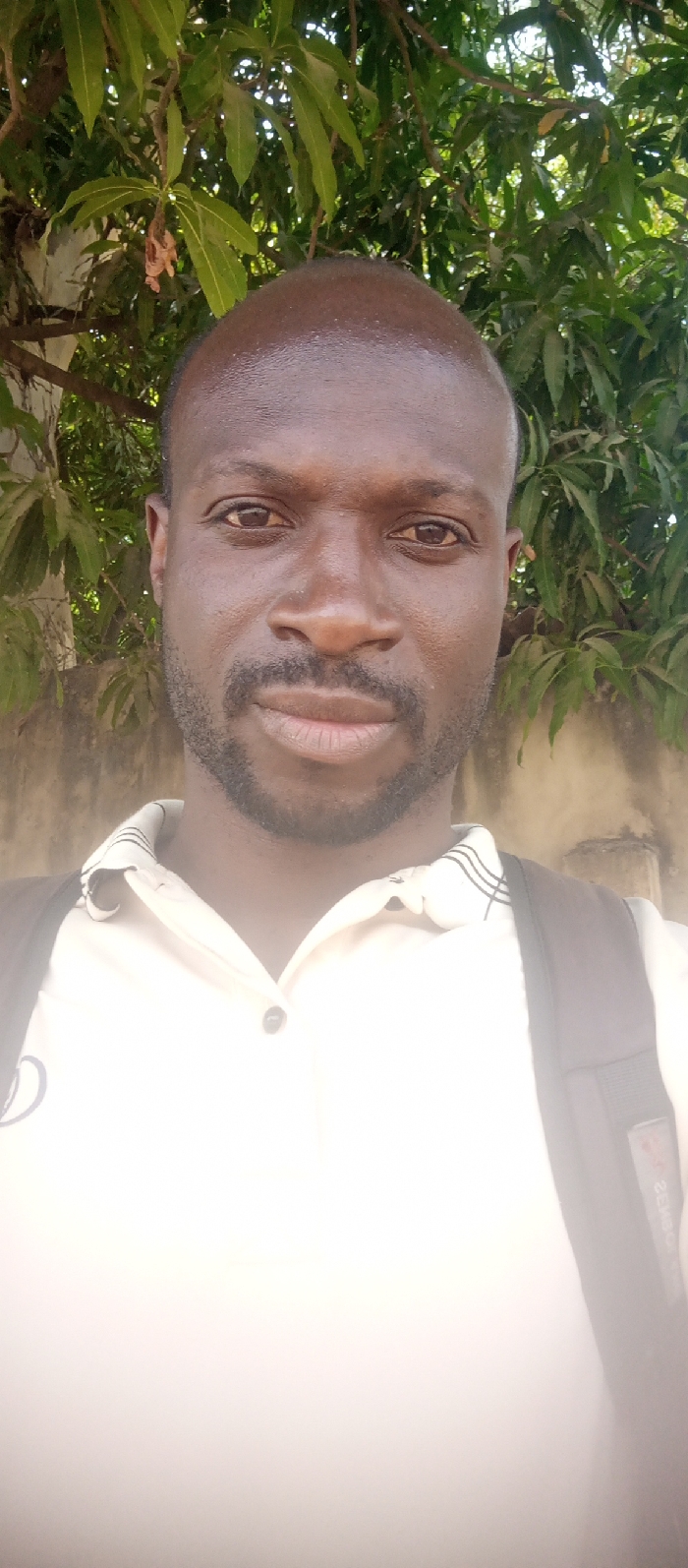A close-up image depicts an adult male of dark complexion, with a shaven head and a short dark beard. His forehead exhibits a slight sheen. He is wearing a light-colored (cream/beige) collared polo shirt with two dark buttons and a subtle dark striped pattern on the collar. A dark-colored backpack strap is visible over his right shoulder. He looks directly at the camera with a neutral expression. The background features dense green foliage from trees or shrubs overhead and a textured, light-brown concrete wall behind him. The scene is situated outdoors in Barden Yana, Nigeria.