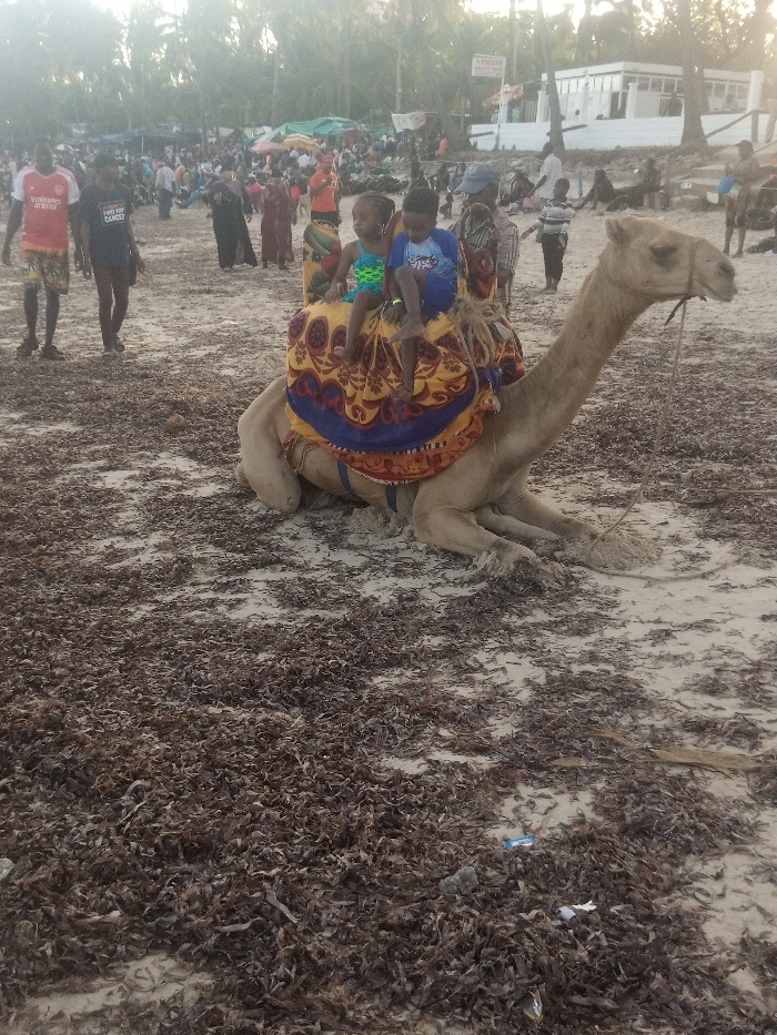 This image depicts a busy coastal scene in Shanzu ward, Kenya. In the foreground, a light brown dromedary camel is resting on sandy terrain, facing right. The camel wears a brightly patterned saddle blanket in yellow, orange, blue, and red, secured with blue straps. Two young children are seated on the camel's back; the girl on the left wears a green and blue patterned top, and the boy on the right wears a blue t-shirt with a white graphic. Both children are barefoot. A rope is attached to the camel's head harness, extending downwards. The ground around the camel and extending into the mid-ground is light-colored sand heavily interspersed with dark brown, dried seaweed and scattered litter, including plastic debris. The background reveals a densely populated beach area. Numerous individuals are visible walking, standing, and congregating across the sandy expanse. To the left, a man in a red and white "Arsenal Emirates Fly Better" t-shirt and patterned shorts walks alongside another man in a dark t-shirt featuring white text. Various other people are dressed in casual attire, some in patterned fabrics. Further in the background, a white multi-story building with a flat roof is discernible on the right side. Several tents and temporary market stalls are present across the mid-background. A white sign with dark lettering, partially visible, reads "PIRATE BOUNTY PARK." Palm trees and other foliage line the horizon. The ambient lighting suggests either late afternoon or early morning conditions, casting a soft, warm light over the scene.
