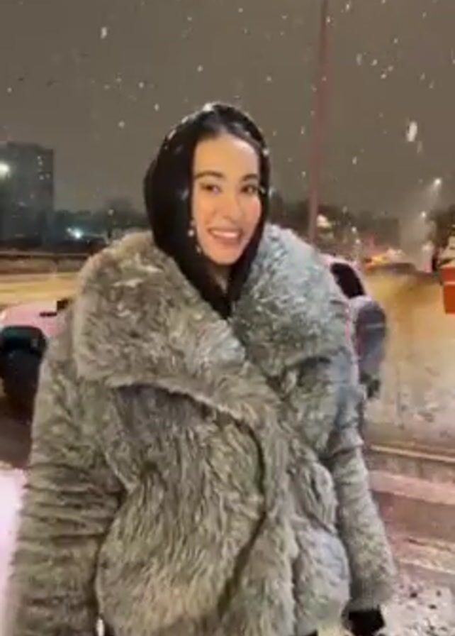 A woman stands outside on a snowy night. She is wearing a large, grey faux fur coat over a black hooded top, black pants, and gloves. A cream-colored scarf is draped across her chest. She has a black handbag in her hand. The woman is smiling and appears excited, looking up at the falling snow, and turning slightly. The background includes a city street with cars passing, streetlights illuminating the snow, and buildings visible in the distance. There is snow accumulated on the ground beside the sidewalk. The video appears to be recorded in portrait mode.